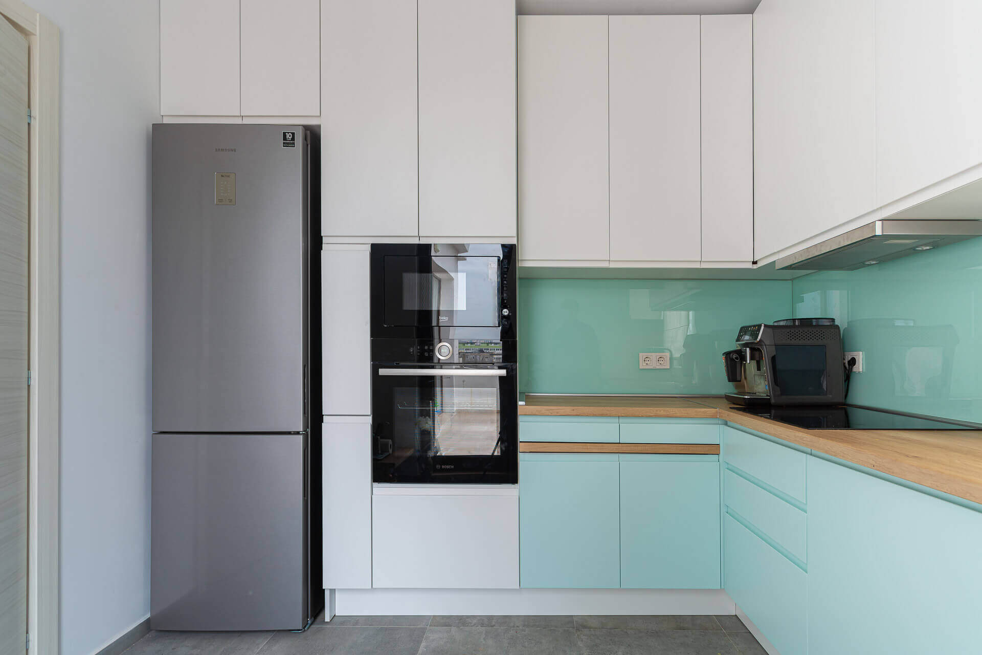 We are showcasing a white kitchen with a closed design. In apartment buildings, kitchens are not very generous in terms of space. We chose white cabinetry extending to the ceiling with milled handles and added a blue accent color. We wanted to prevent the space from being crowded, while ensuring the generous storage spaces, so we opted for unitary and simple finishes that complement the space perfectly.